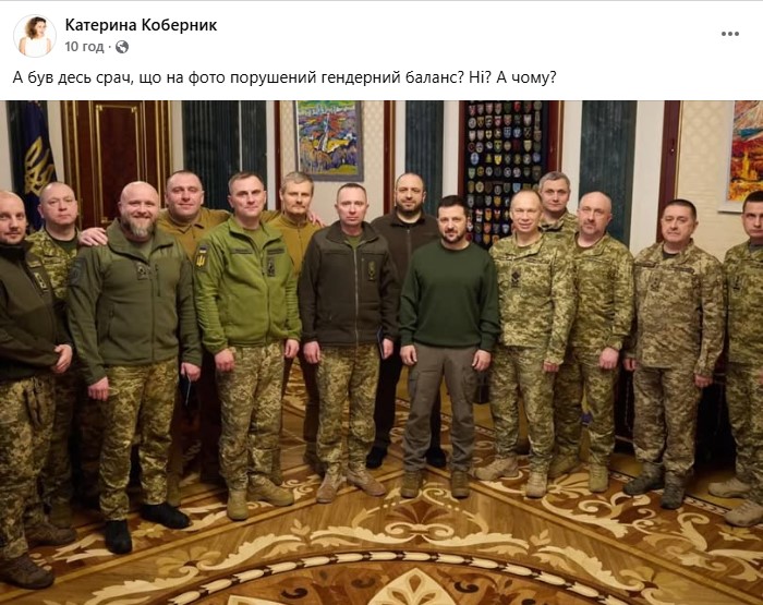 “А був десь срач, що на фото порушений гендерний баланс? Ні? А чому?” — зазначила Коберник.