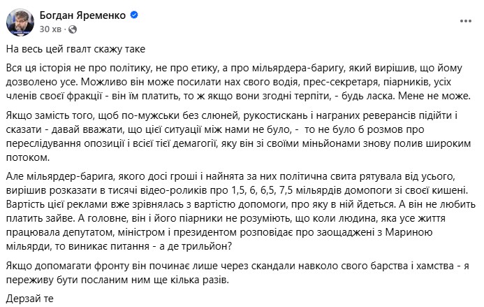 “Якщо допомагати фронту він починає лише через скандали навколо свого барства і хамства – я переживу бути посланим ним ще кілька разів. Дерзай те”, — зазначив Яременко.