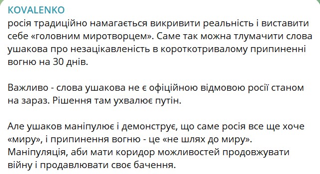 За словами Коваленка, Кремль таким чином намагається себе виставити чи не головним миротворцем: мовляв, потрібне не тимчасове перемир’я, а “остаточне вирішення конфлікту” та довготривалий мир. Хоча при цьому РФ і є головним воєнним агресором у цій ситуації.